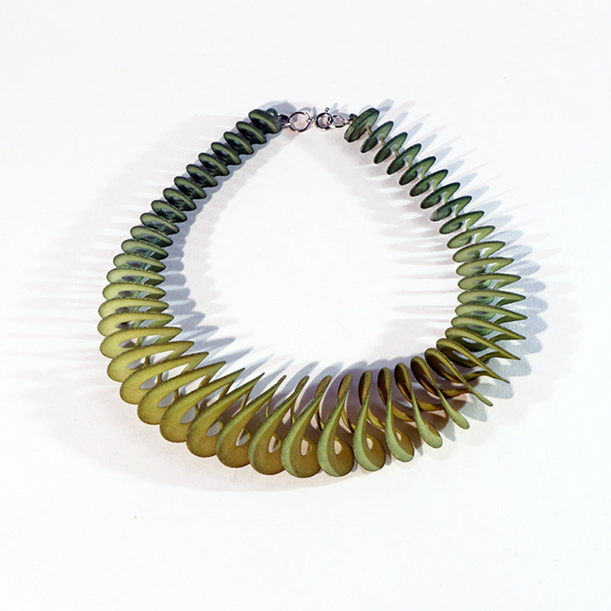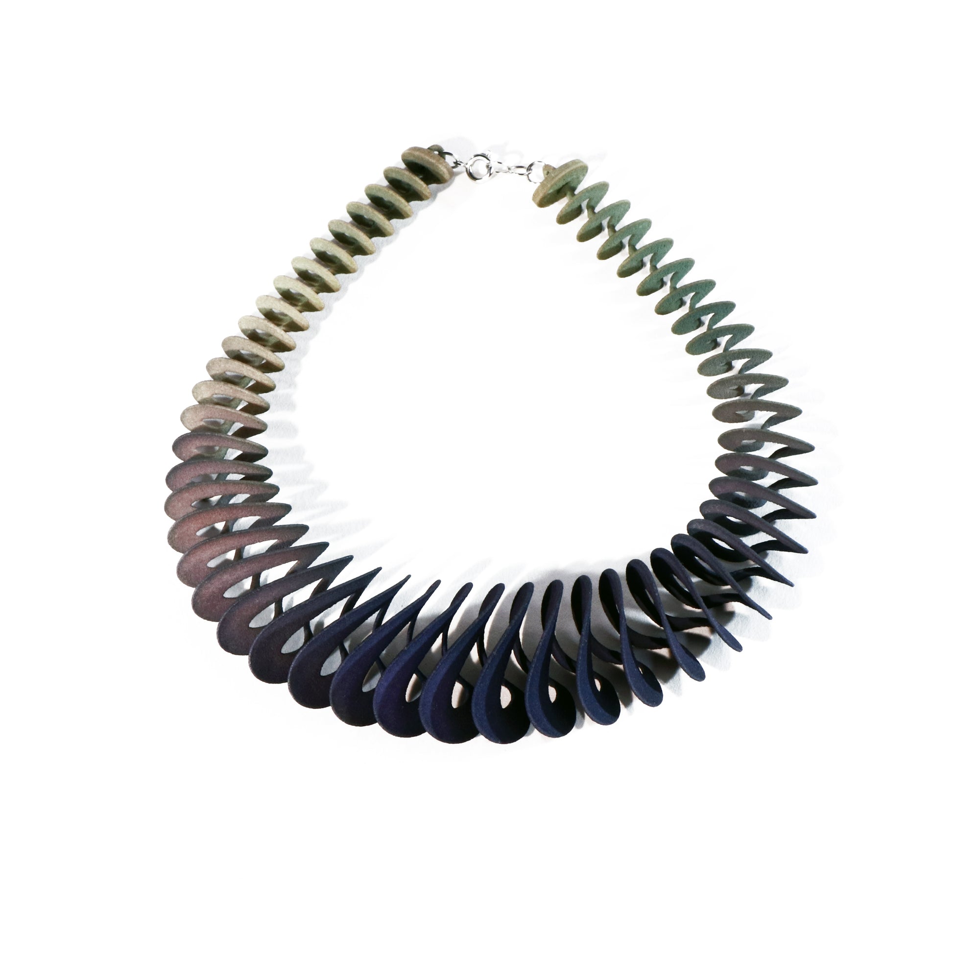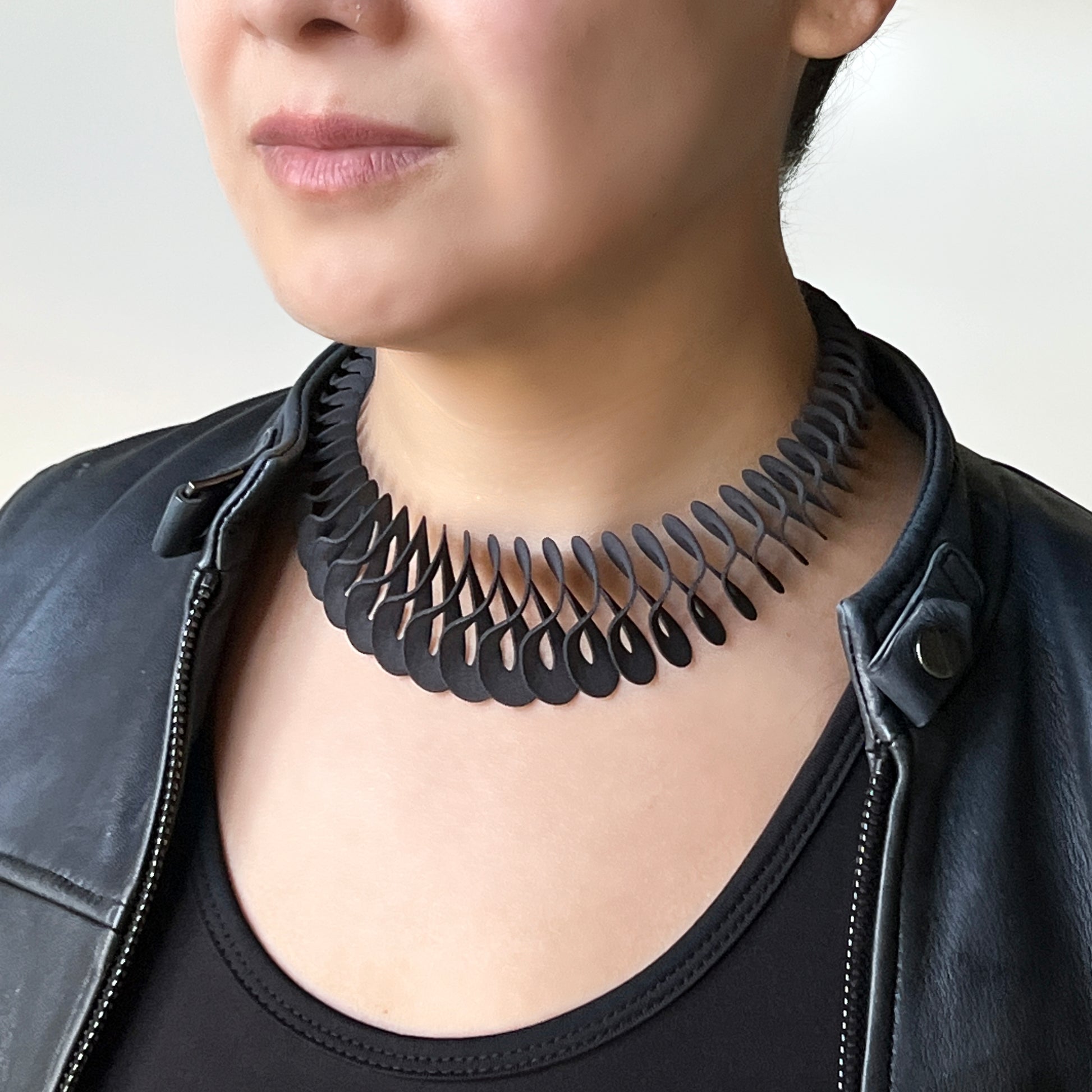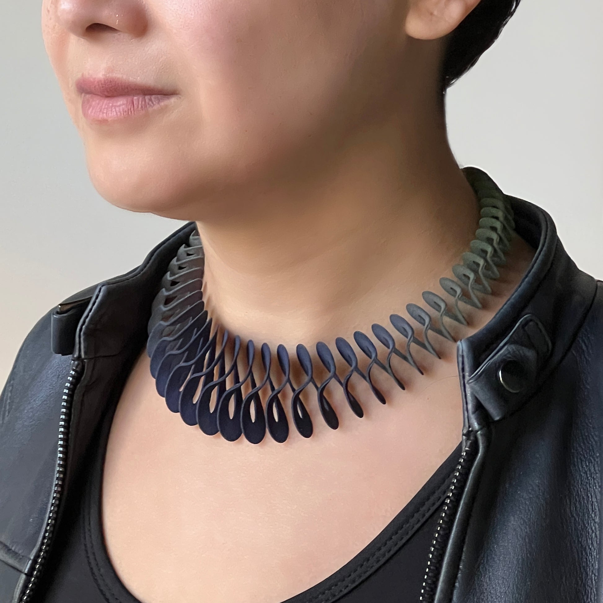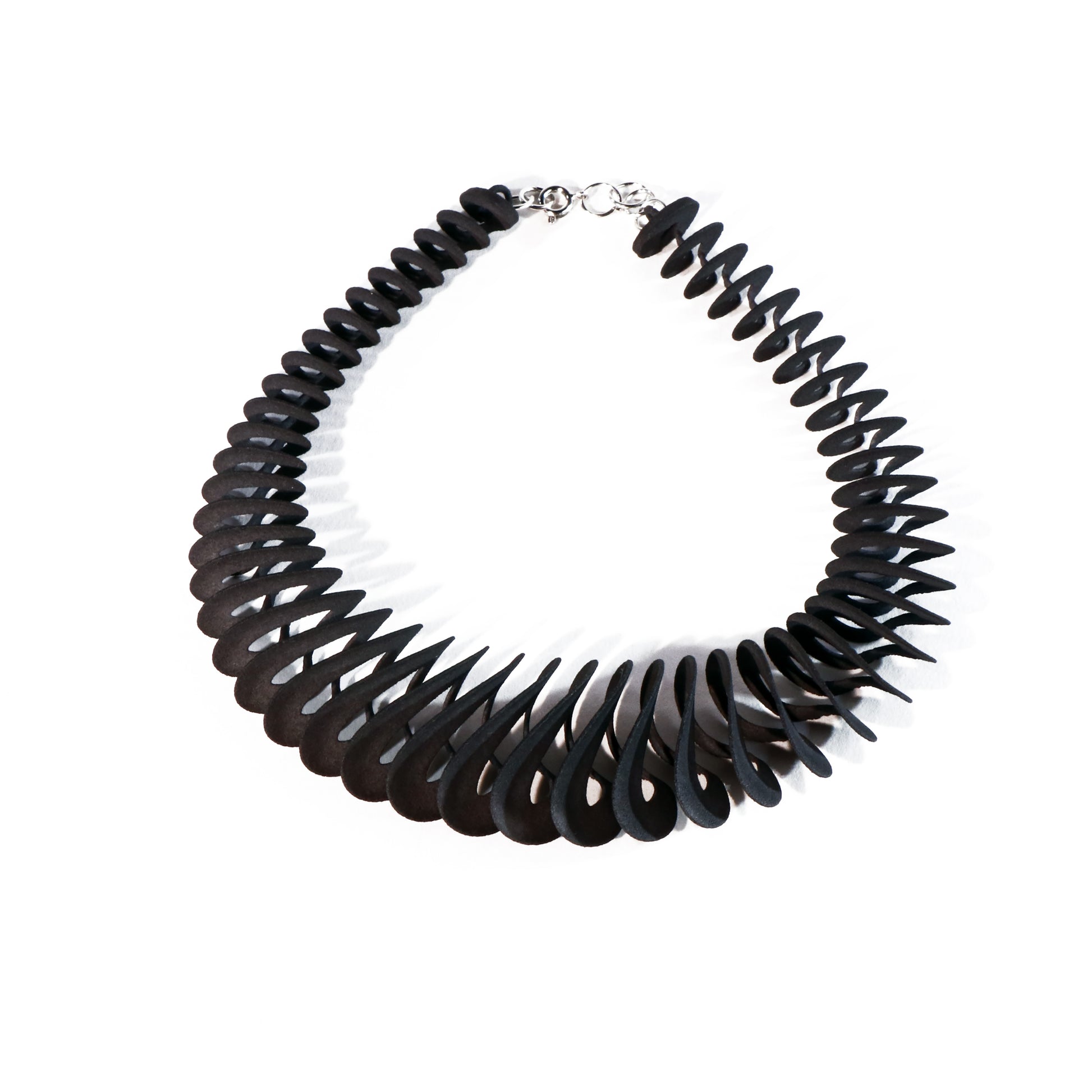 Airylace" is an artistic and distinctive flexible 3D-printed necklace meticulously designed to complement the contours of the neck. Crafted from durable PA 12, it gently curves to follow the natural shape of the neck while retaining its artistic and sculptural qualities.