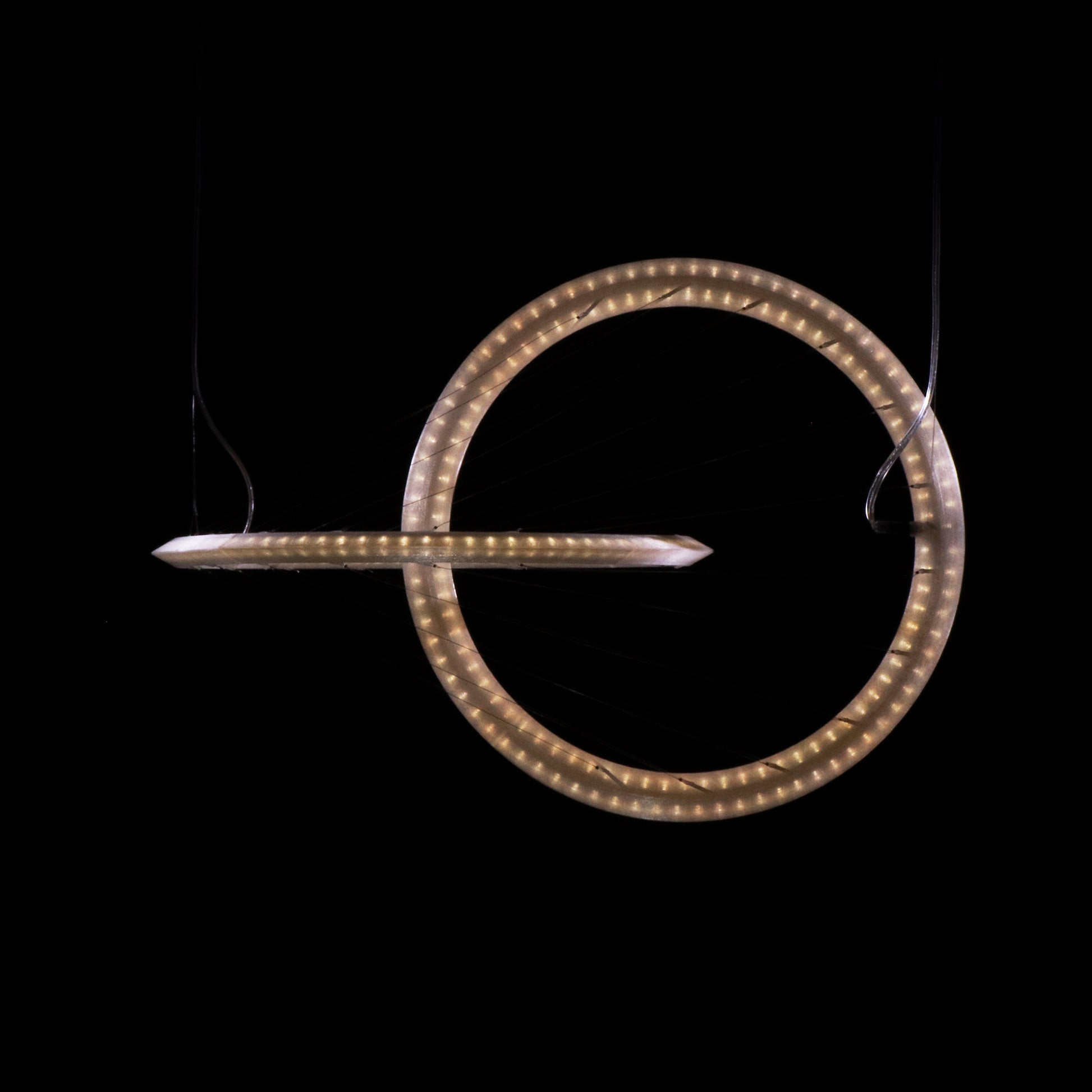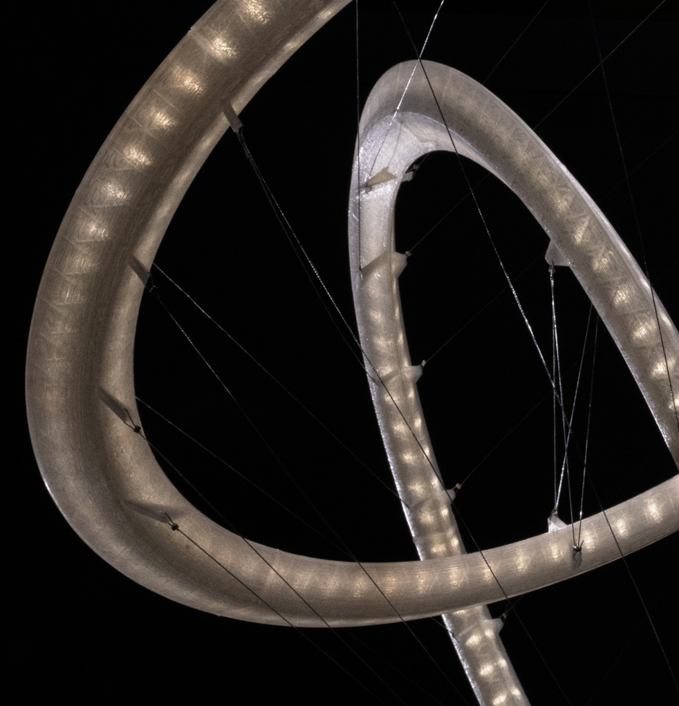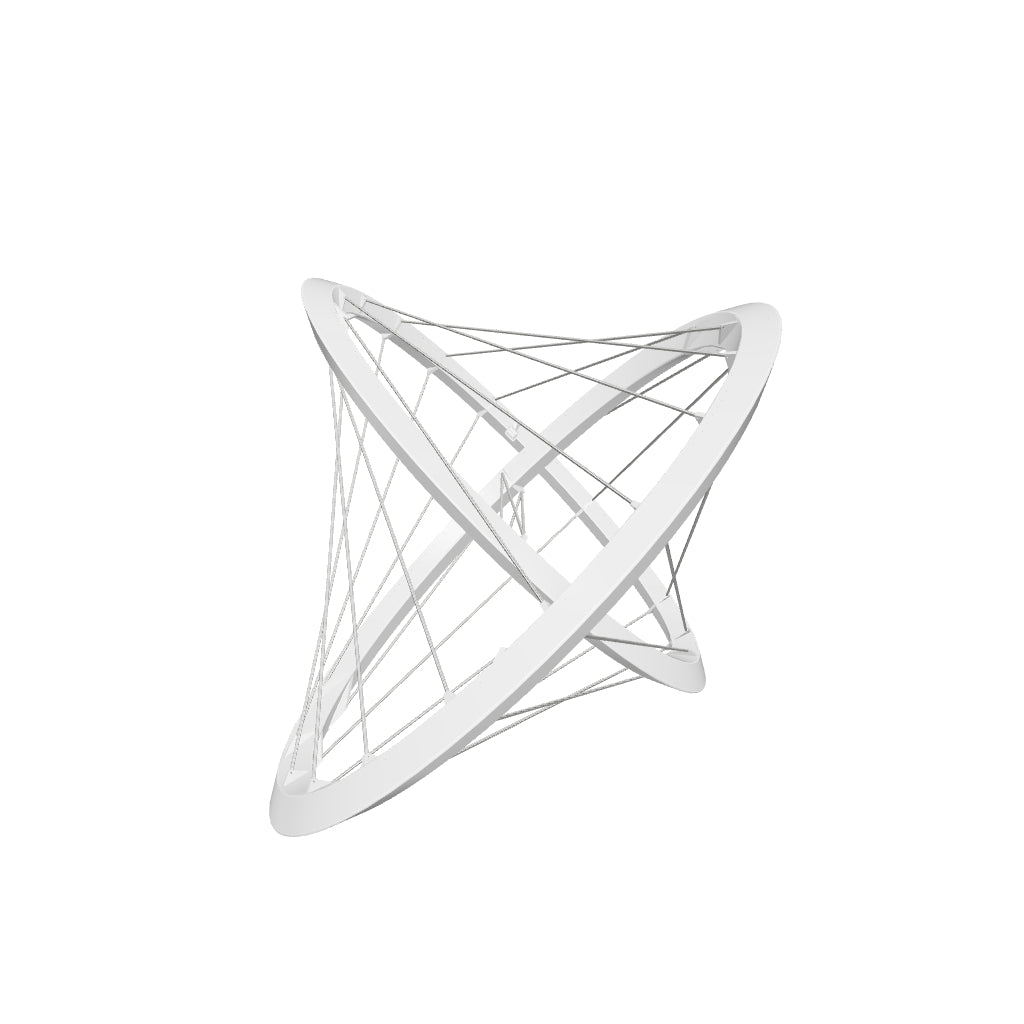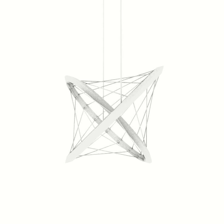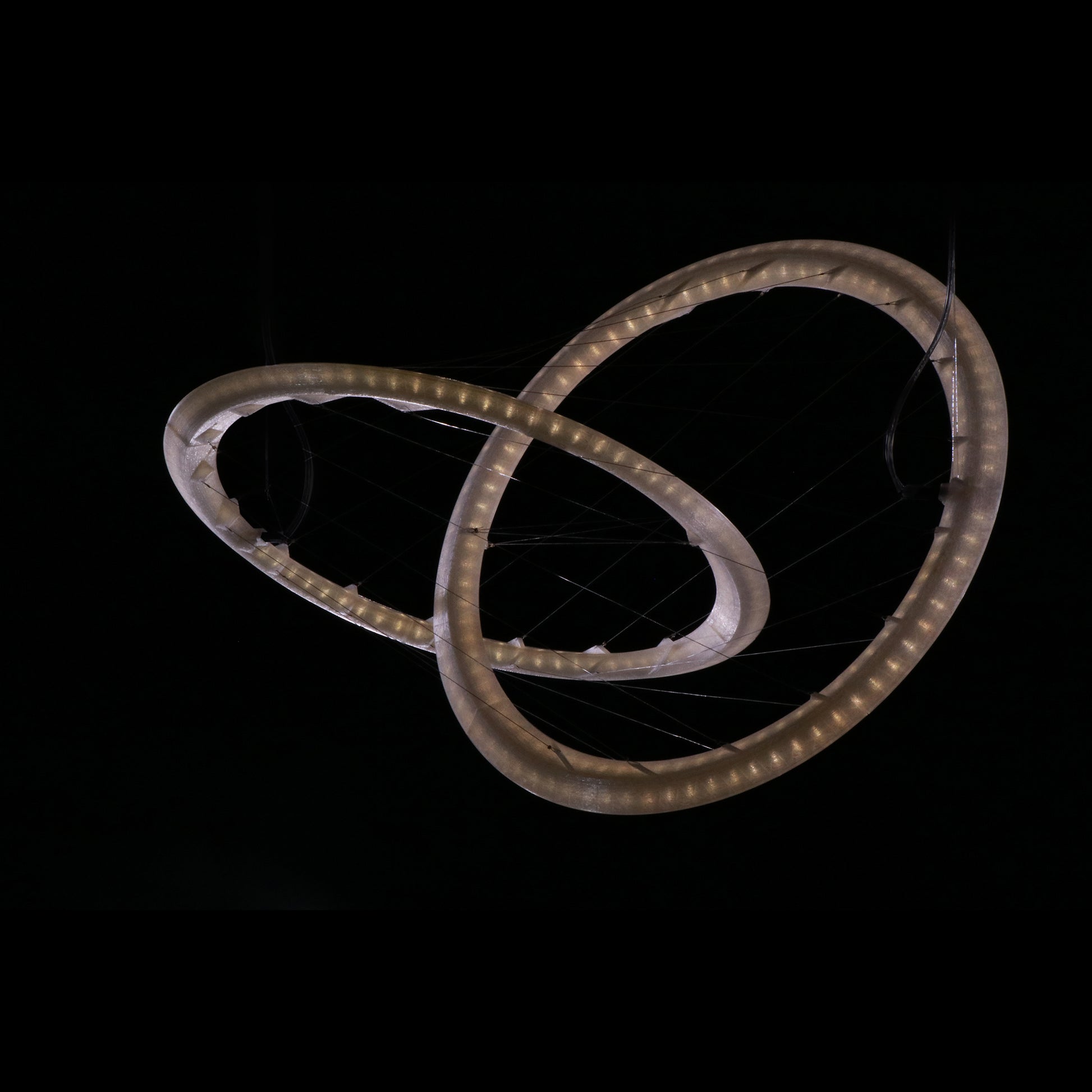 The skeletal frames of these Oloid-based lamps are informed by placing two congruent circles in perpendicular planes when the center of each circle is intersected by the perimeter of the other. The lamp is based on principles of tensegrity when several cables hold two suspended rings together. When walking all around these lamps reveals numerous forms. Both lamps can smoothly roll across the table to fascinate young and old alike.