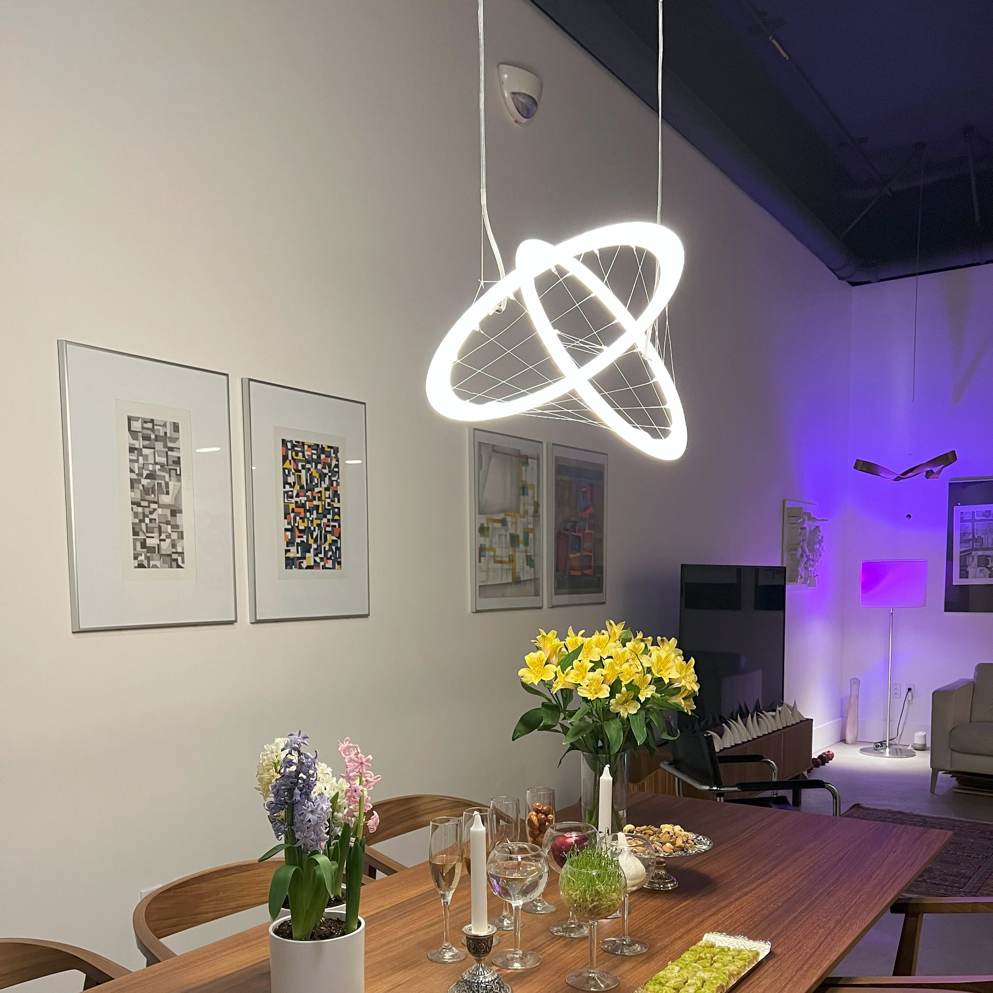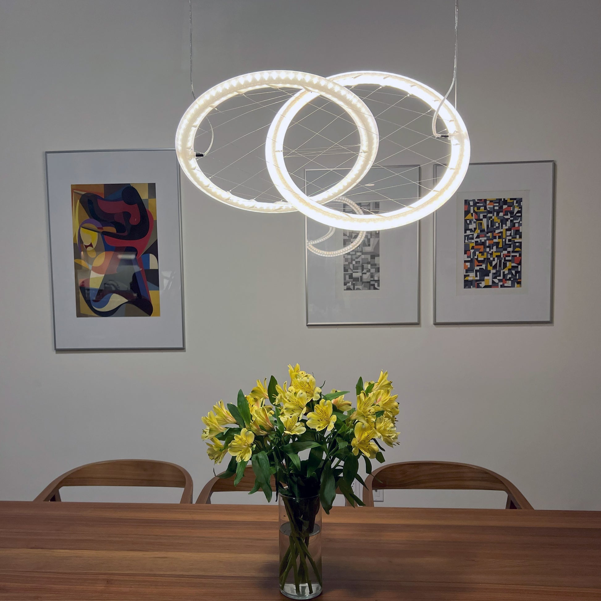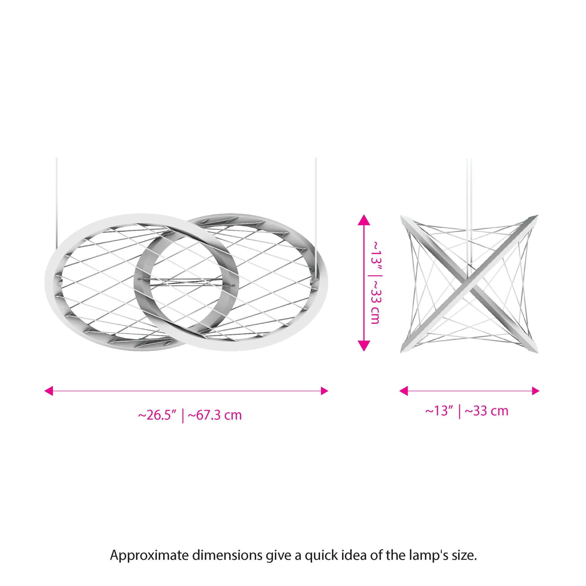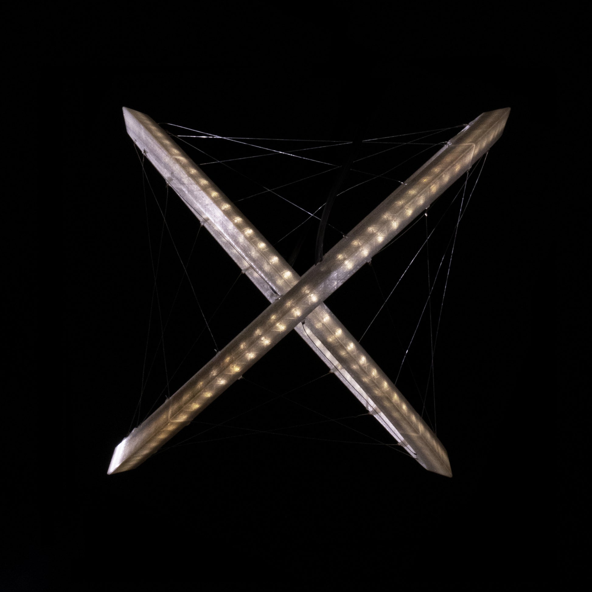 The skeletal frames of these Oloid-based lamps are informed by placing two congruent circles in perpendicular planes when the center of each circle is intersected by the perimeter of the other. The lamp is based on principles of tensegrity when several cables hold two suspended rings together. When walking all around these lamps reveals numerous forms. Both lamps can smoothly roll across the table to fascinate young and old alike.