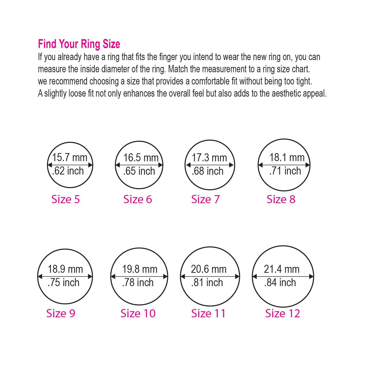 To determine the right size, if you already have a ring that fits the finger you intend to wear the new ring on, you can measure the inside diameter of the existing ring. Simply match this measurement to a ring size chart for an accurate fit.