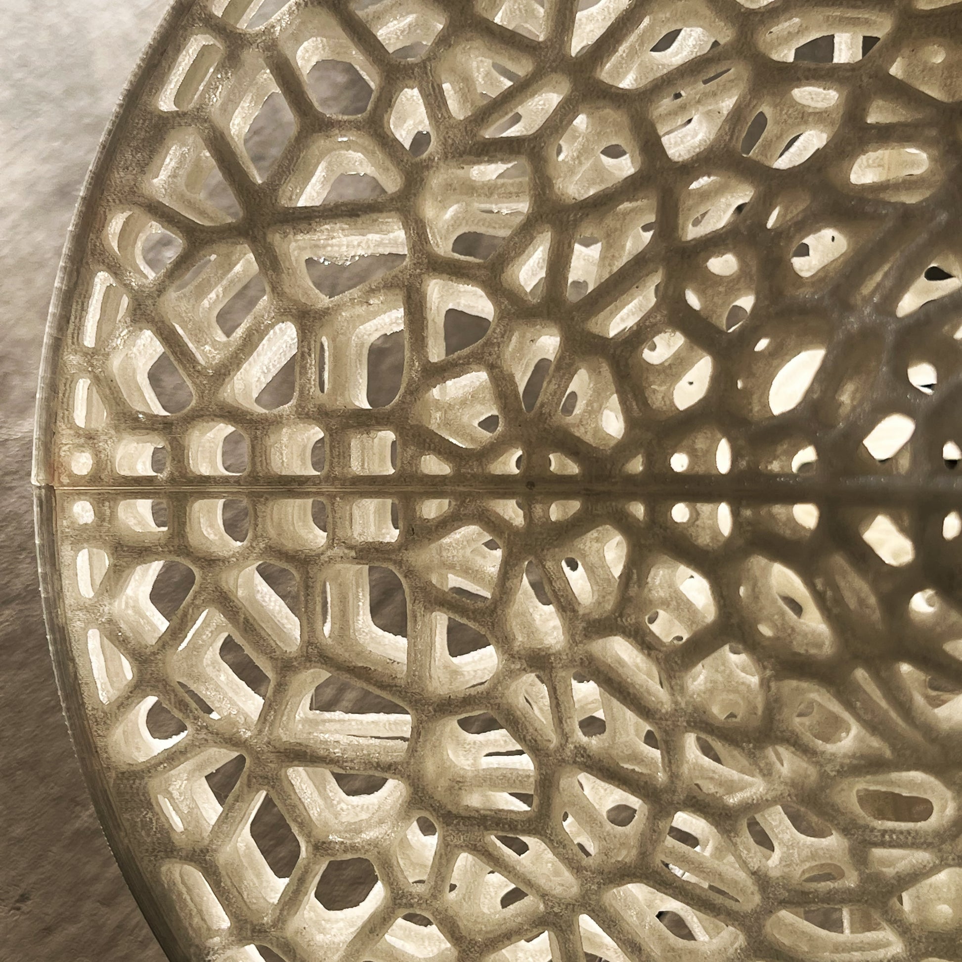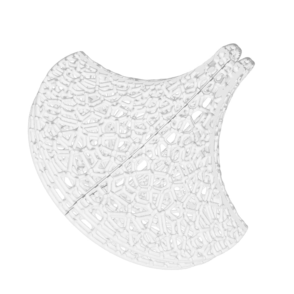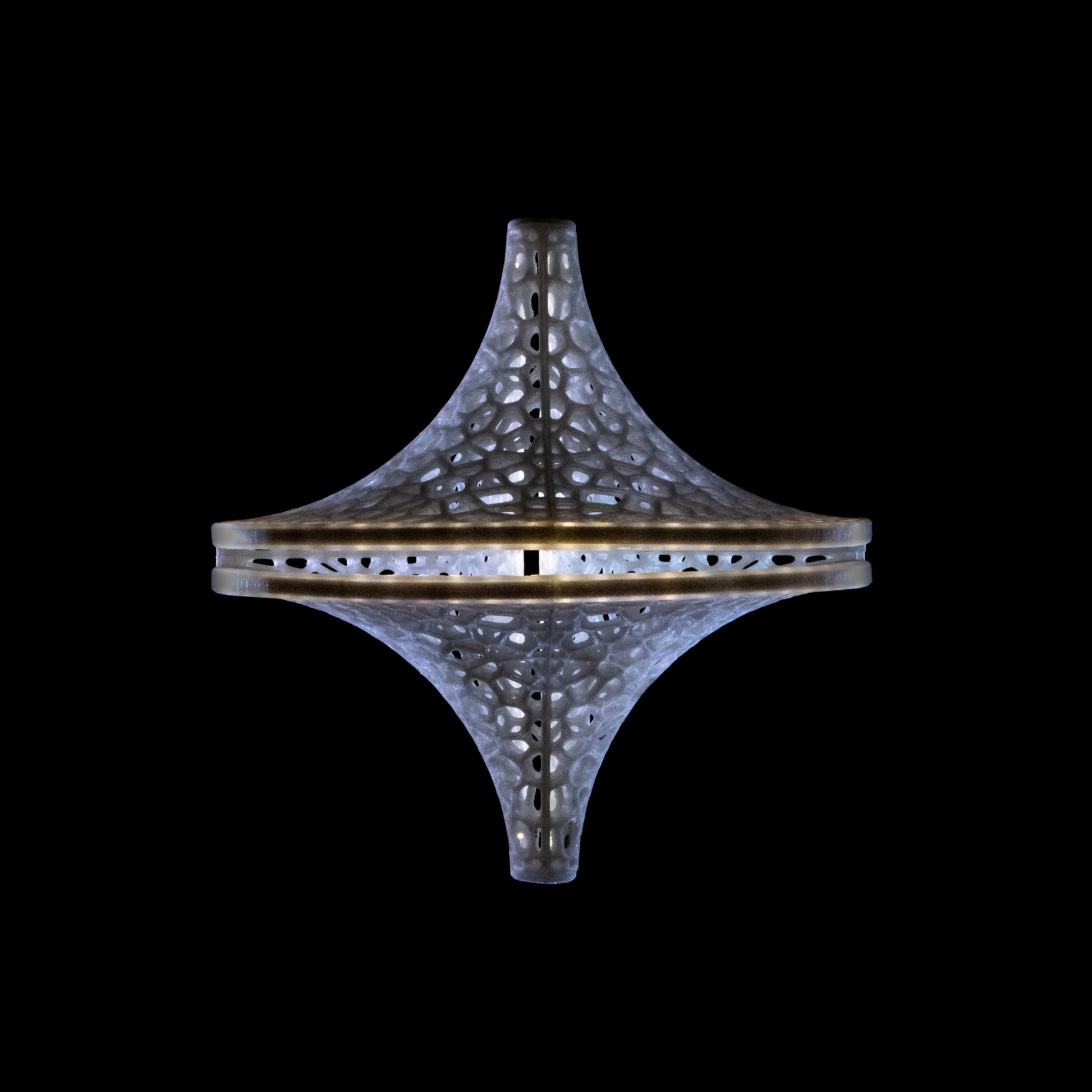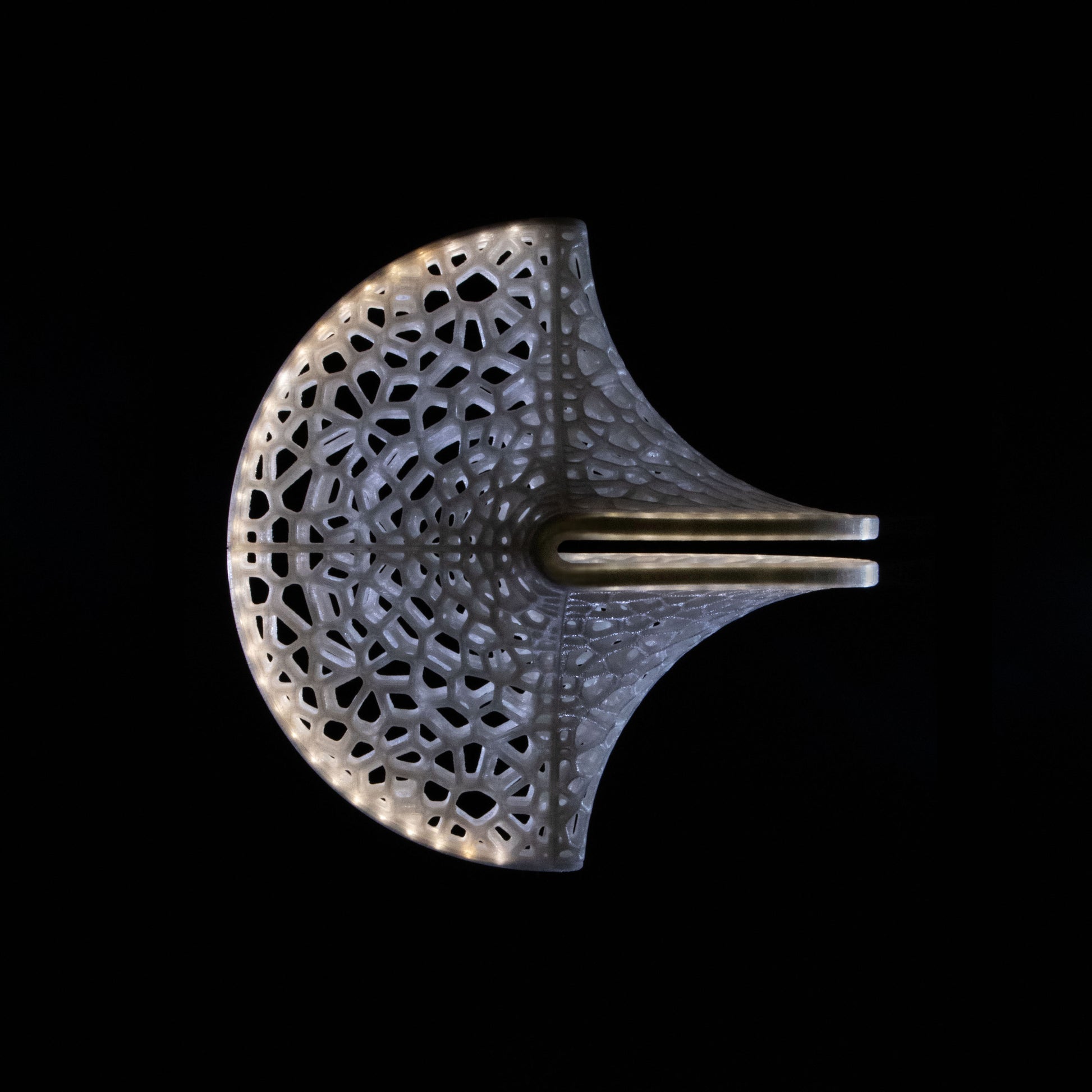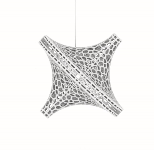The Slight is a hanging 3D-printed lamp that diffuses light through its translucent Voronoi tessellated cells. Casting stunning shadows on the wall and ceiling, the cells follow the surface of a Sphericon volume. The Sphericon skeletal version is made of two perpendicular half-circles where the center of each circle lies on the center of the other one. The LED strip lights are hidden around the two congruent semi-circular edges of the Sphericon.