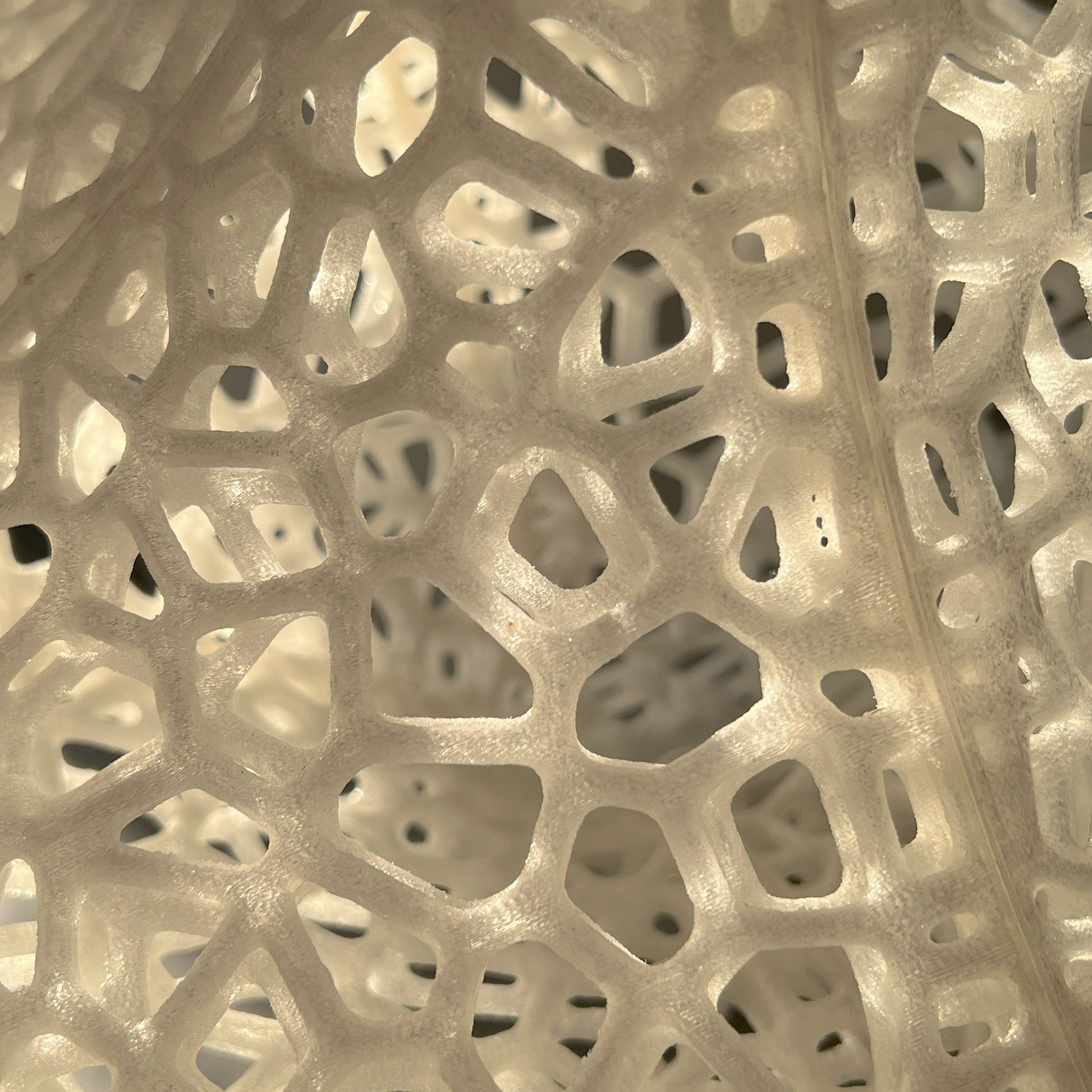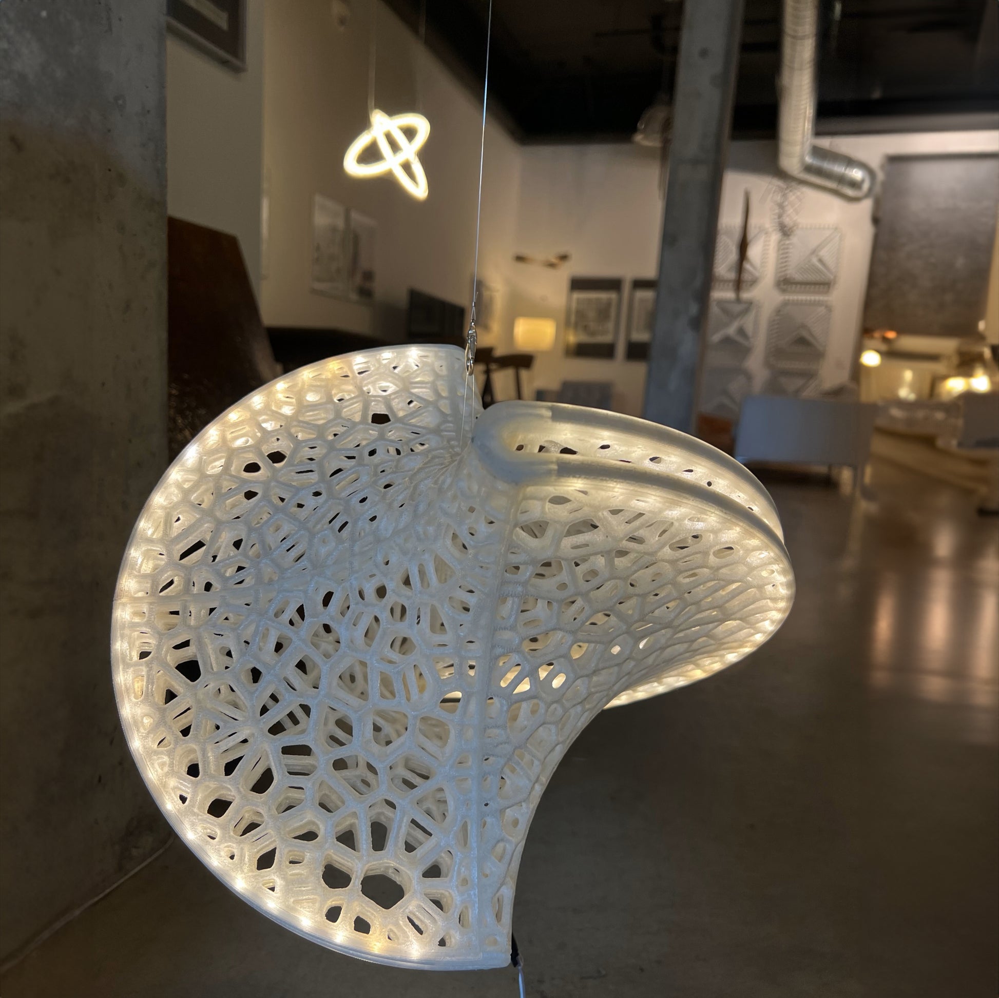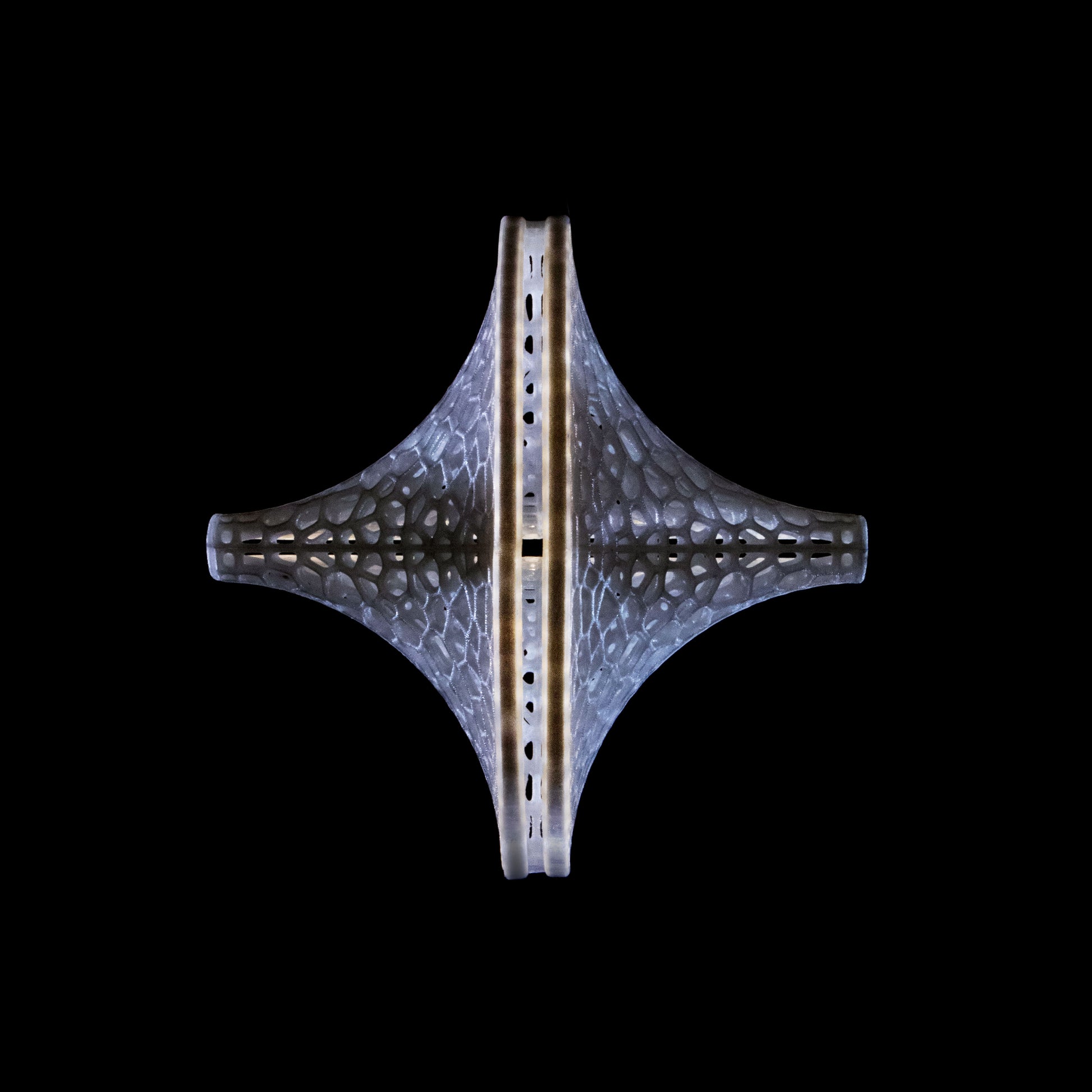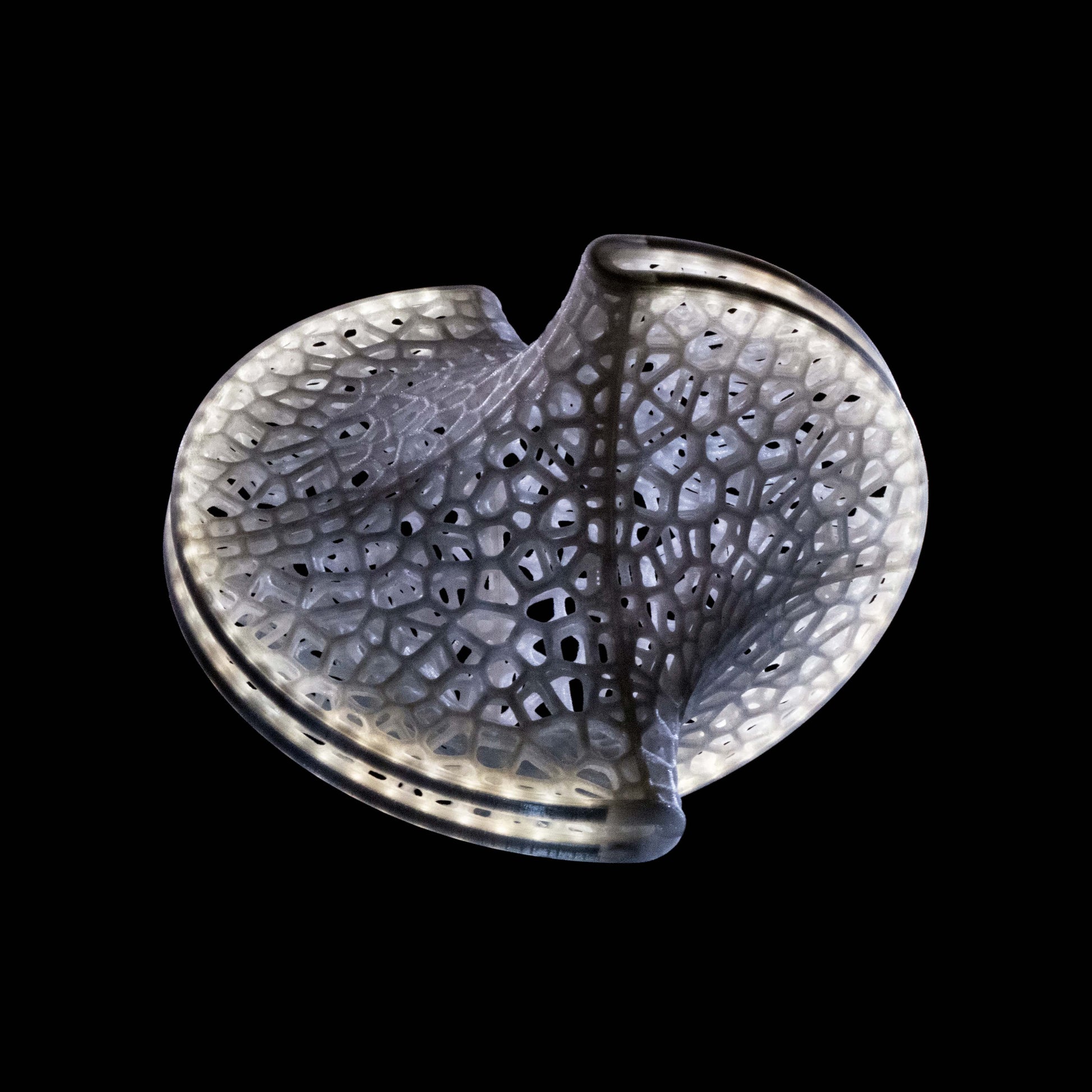 The Slight is a hanging 3D-printed lamp that diffuses light through its translucent Voronoi tessellated cells. Casting stunning shadows on the wall and ceiling, the cells follow the surface of a Sphericon volume. The Sphericon skeletal version is made of two perpendicular half-circles where the center of each circle lies on the center of the other one. The LED strip lights are hidden around the two congruent semi-circular edges of the Sphericon.