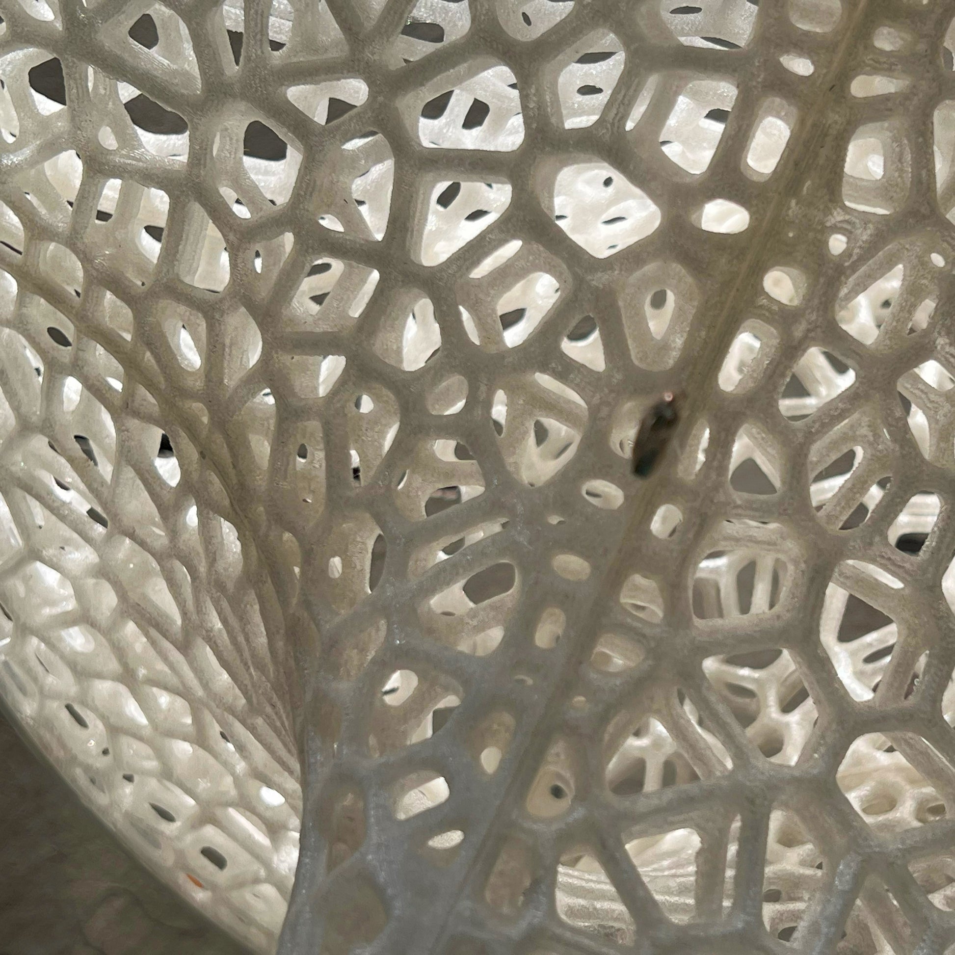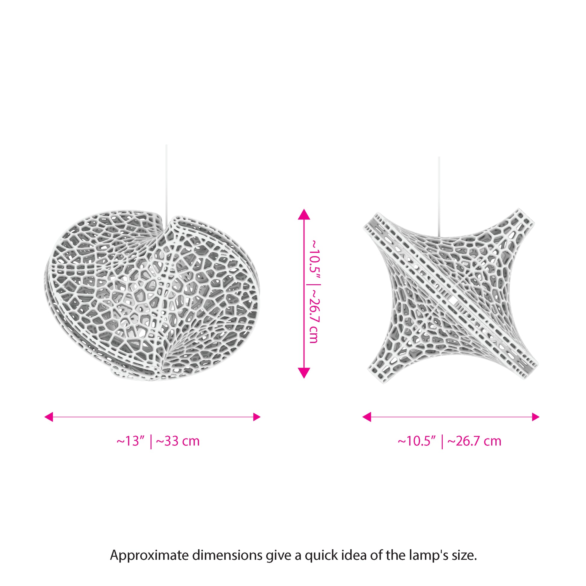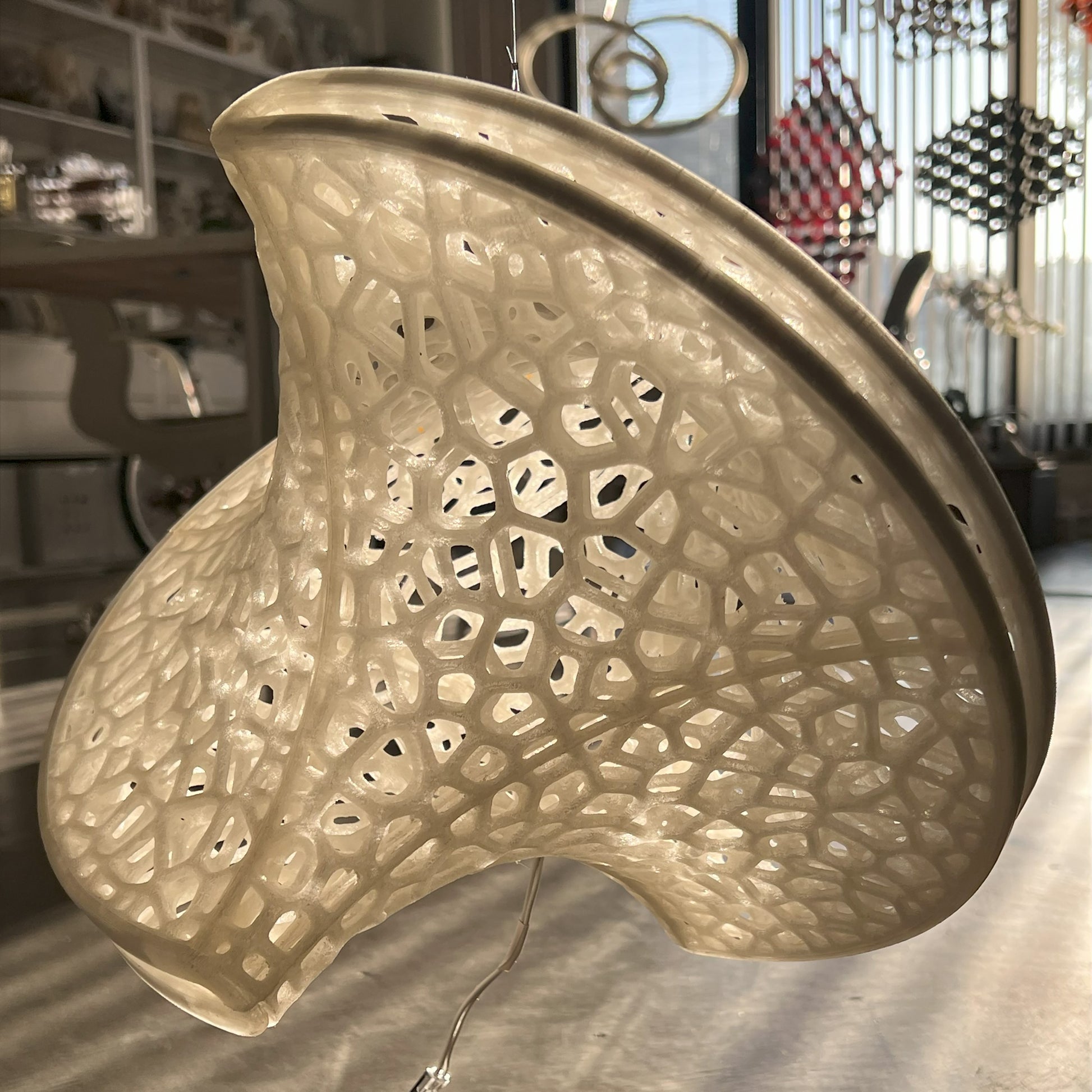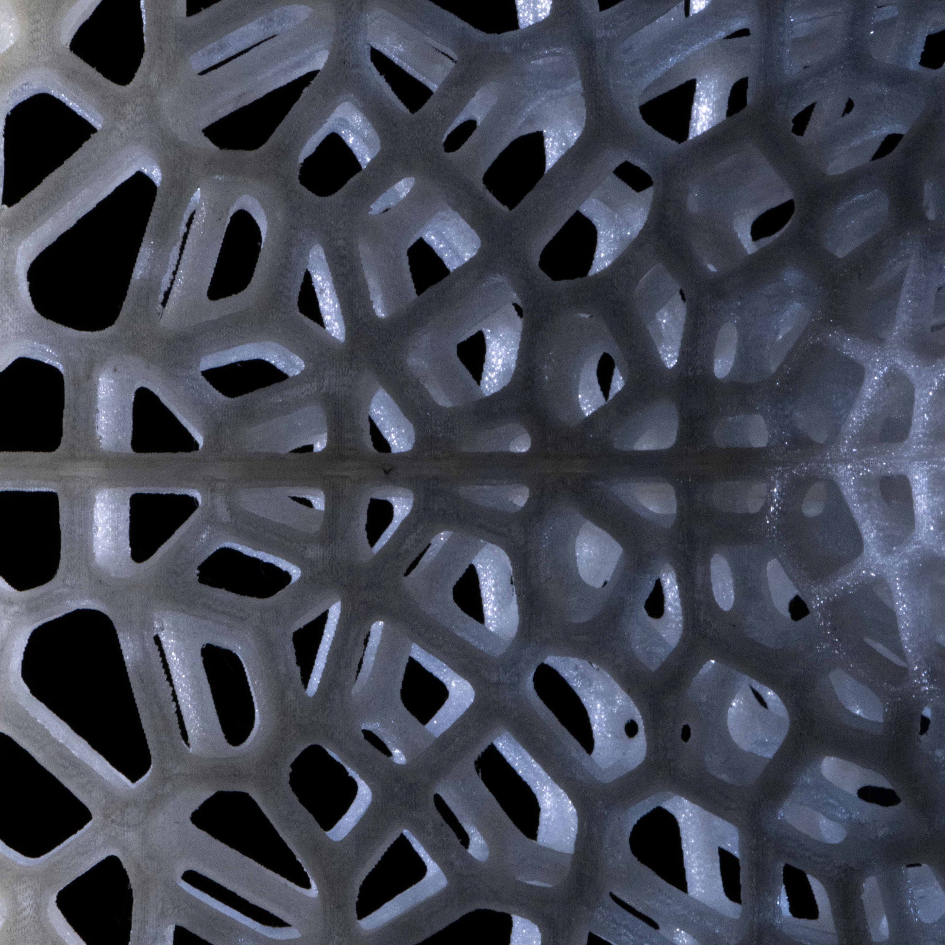 The Slight is a hanging 3D-printed lamp that diffuses light through its translucent Voronoi tessellated cells. Casting stunning shadows on the wall and ceiling, the cells follow the surface of a Sphericon volume. The Sphericon skeletal version is made of two perpendicular half-circles where the center of each circle lies on the center of the other one. The LED strip lights are hidden around the two congruent semi-circular edges of the Sphericon.